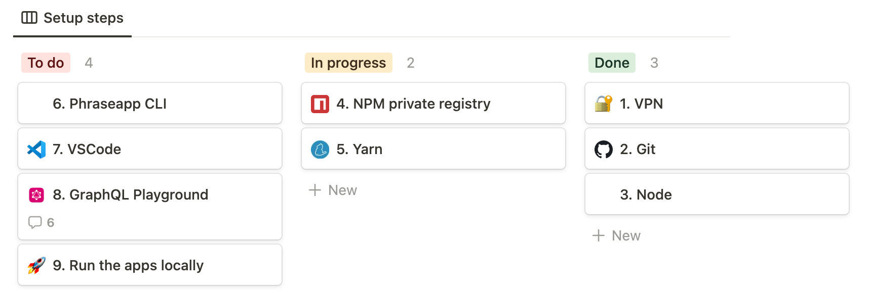 Most developer teams already use ticket-based frameworks for tracking their tasks’ statuses so we figured setting up a kanban board for tracking specific parts of the onboarding process would feel natural to most recruits. Right now we’re using it only for the environment setup, but it could be done for the rest of the onboarding too. The blocks redirect to the aforementioned pages detailing all the steps to complete – so that anybody onboarding or starting from a fresh setup can be ready in less than a day.