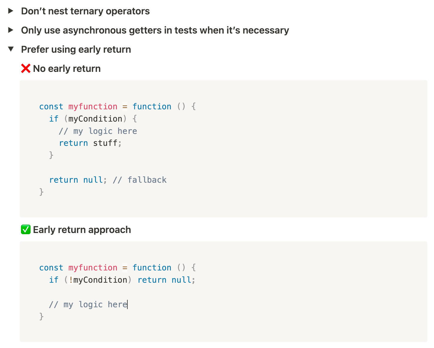 Finally, for all guidelines that do not fit in a broader category we have the do’s and don’ts section. There we list all preferences regarding general code styling and good practices such as syntax specifics and naming.